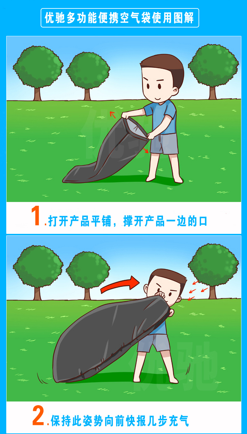 5. 便携不用可放气后收纳。使用方法:
