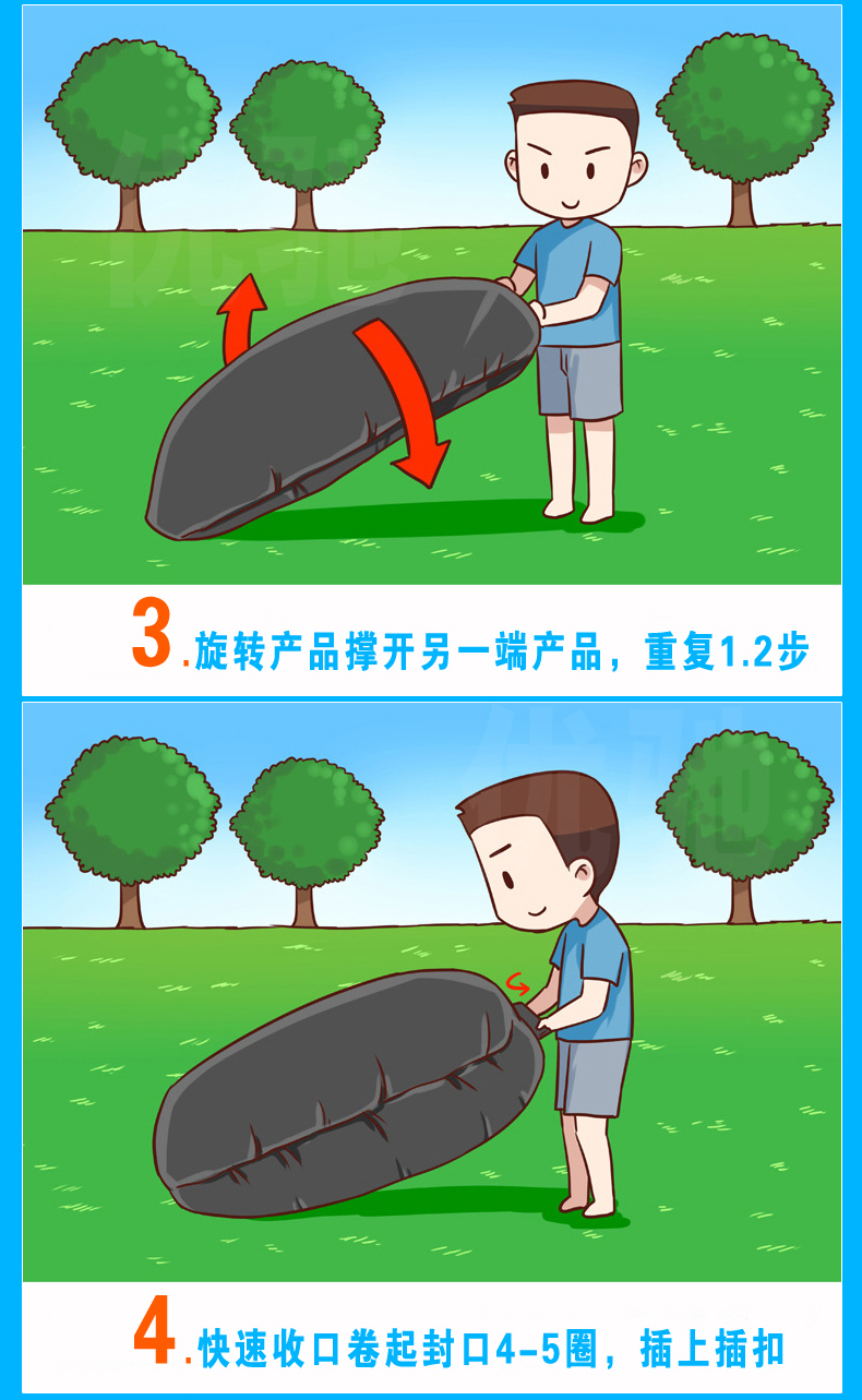 2.封口卷起注意事项:在卷封口的时候一定要对齐用力卷紧,直到卷不动为止,这样口袋充气才会饱满。而且卷的时候一定要尽量平整!否则不美观,而且还容易锁死封口后从封口处漏气的可能!