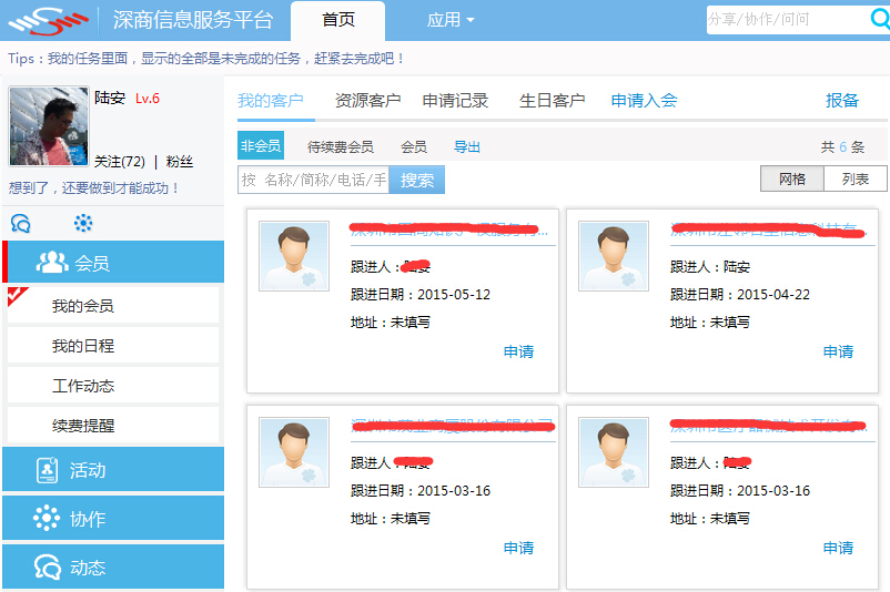 1、会员管理:我的会员管理、我的资源客户管理、待续费管理