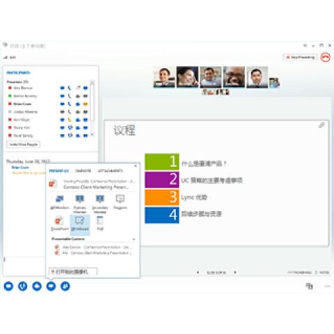 Lync Web App 允许 PC 用户和 Mac 用户通过浏览器加入 Lync 会议,并提供包括 IM、语音、多方视频、数据协作、共享在内的完整联机会议体验。